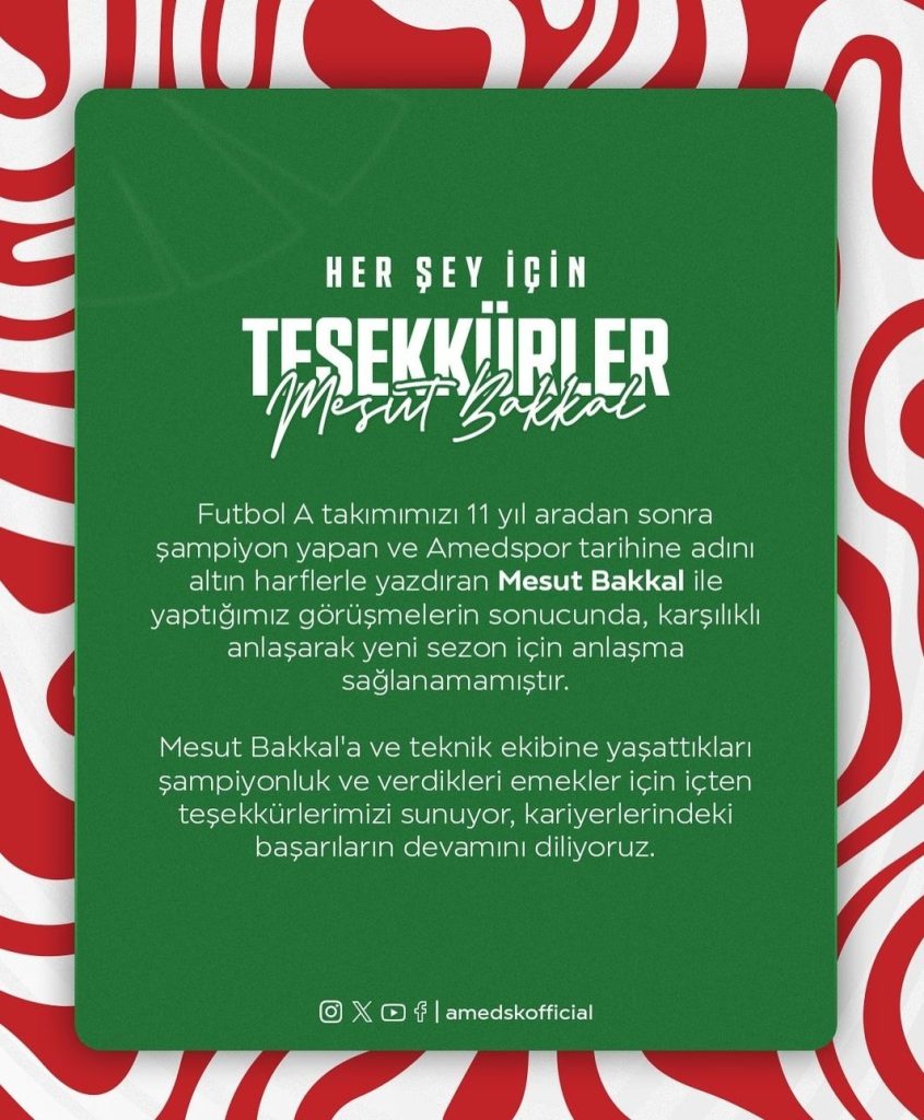 Amedspor teknik direktör Mesut Bakkal ile yeni sezon için anlaşma sağlanamadığını açıkladı!