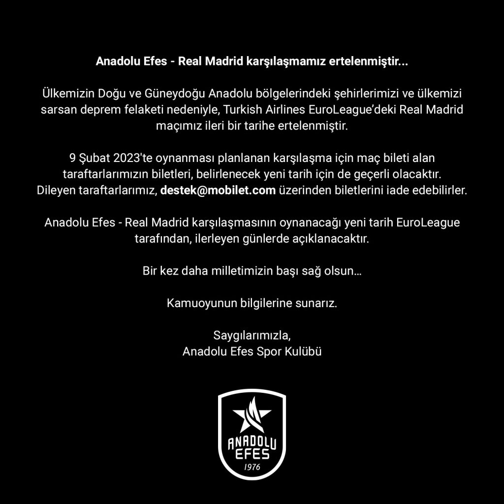 Anadolu Efes: “Ülkemizin Doğu ve Güneydoğu Anadolu bölgelerindeki şehirlerimizi ve ülkemizi sarsan deprem felaketi nedeniyle, EuroLeague’deki Real Madrid maçımız ileri bir tarihe ertelenmiştir”