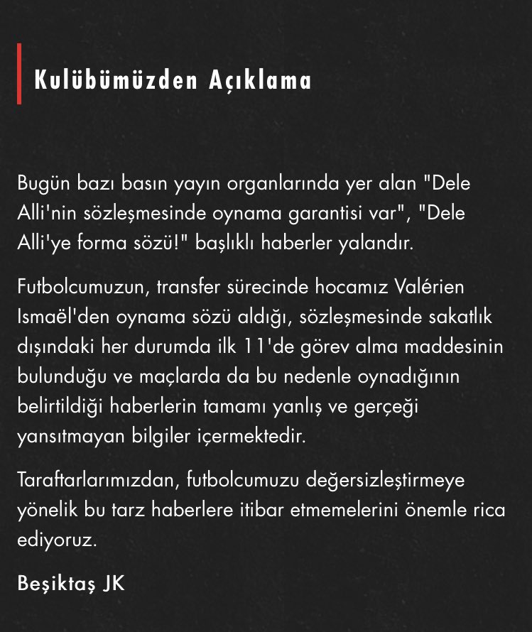 Beşiktaş Kulübü’nden Dele Alli ile ilgili açıklama geldi.