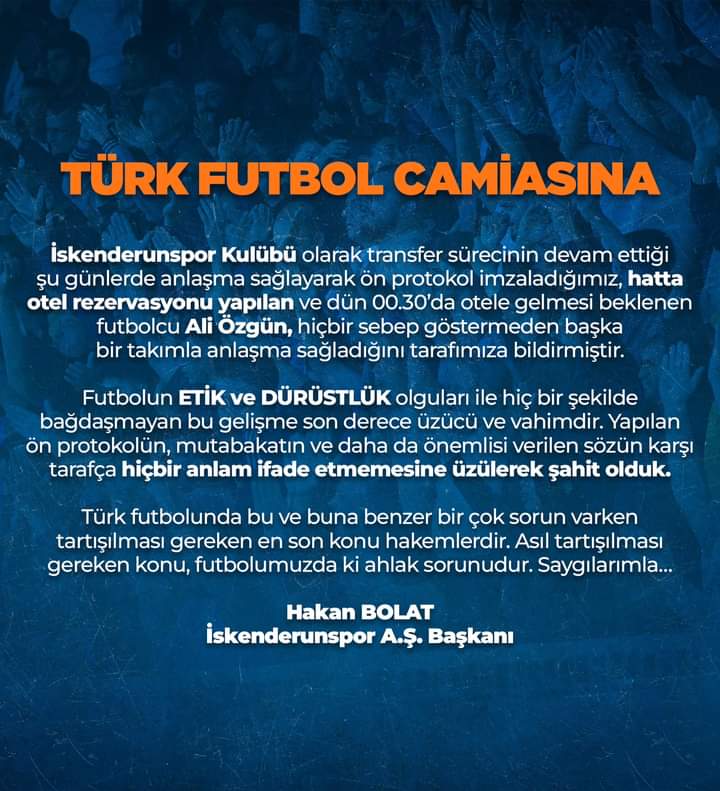 İskenderunspor’dan Ali Özgün transferi ile ilgili açıklama geldi.