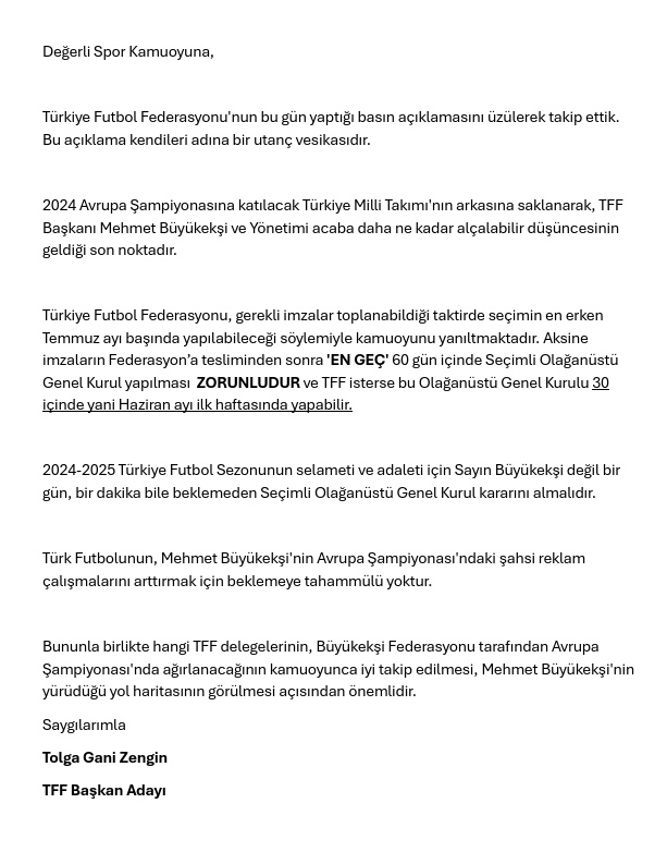 TFF Başkan adayı Tolga Gani Zengin Tff’nin açıklaması sonrası flaş bir açıklama yaptı .